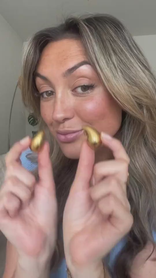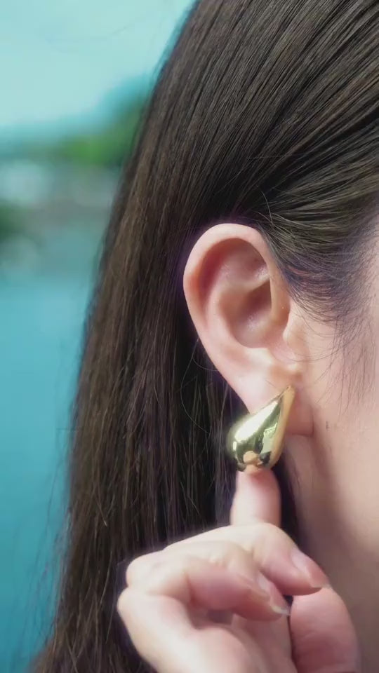 These are water drop earrings! They're small, gold, and shaped like little drops of water. They're made of titanium steel, so they're tough, and they're plated in gold to make them look extra special.